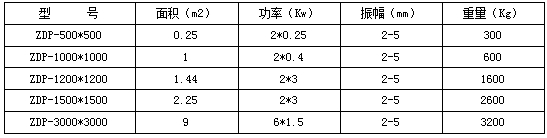 ZDP型振动平台又叫振实台,主要用于物料的震实,减少物料内的空气和缝隙.一般和料仓配套使用;  ZDP型振动平台广泛地使用在冶金、模具/食品、化工、建材等行业。  ZDP型振动平台于生产流程中用于把颗粒、粉状物料从散装到块状、形状等形式的转变。1、ZDP型振动平台在使用过程中,可以通过调节振动电机激振力大小、来使平台上物料实现理想的形式。2、ZDP型振动电机为激振源,噪声低、耗电小、维护简单。3、ZDP型振动平台结构简单。运行可靠、重量轻、体积小、安装简便。4、ZDP型振动平台分为上下振动螺旋振动和三维振动三种振动方式。5、ZDP型振动平台在使用过程中,可以通过调节振动电机激振力大小,来使平台上物料实现理想的形式。1、ZDP型振动平台产品的高度可以根据使用现场的工艺进行调节;2、ZDP型振动平台的振动方向可分为一维振动(X轴方向振动)、二维振动(X、Y方向振动)、三维振动(X、Y、Z三方向振动);3、选取设备的材质,常用材质材质分为全不锈钢、与物料接触不锈钢、碳钢等类型(其中不锈钢分为201,304,316等);4、设备不局限以上型号,可以根据客户工艺要求非标设计;5、设备基础采用地脚螺栓固定结构;